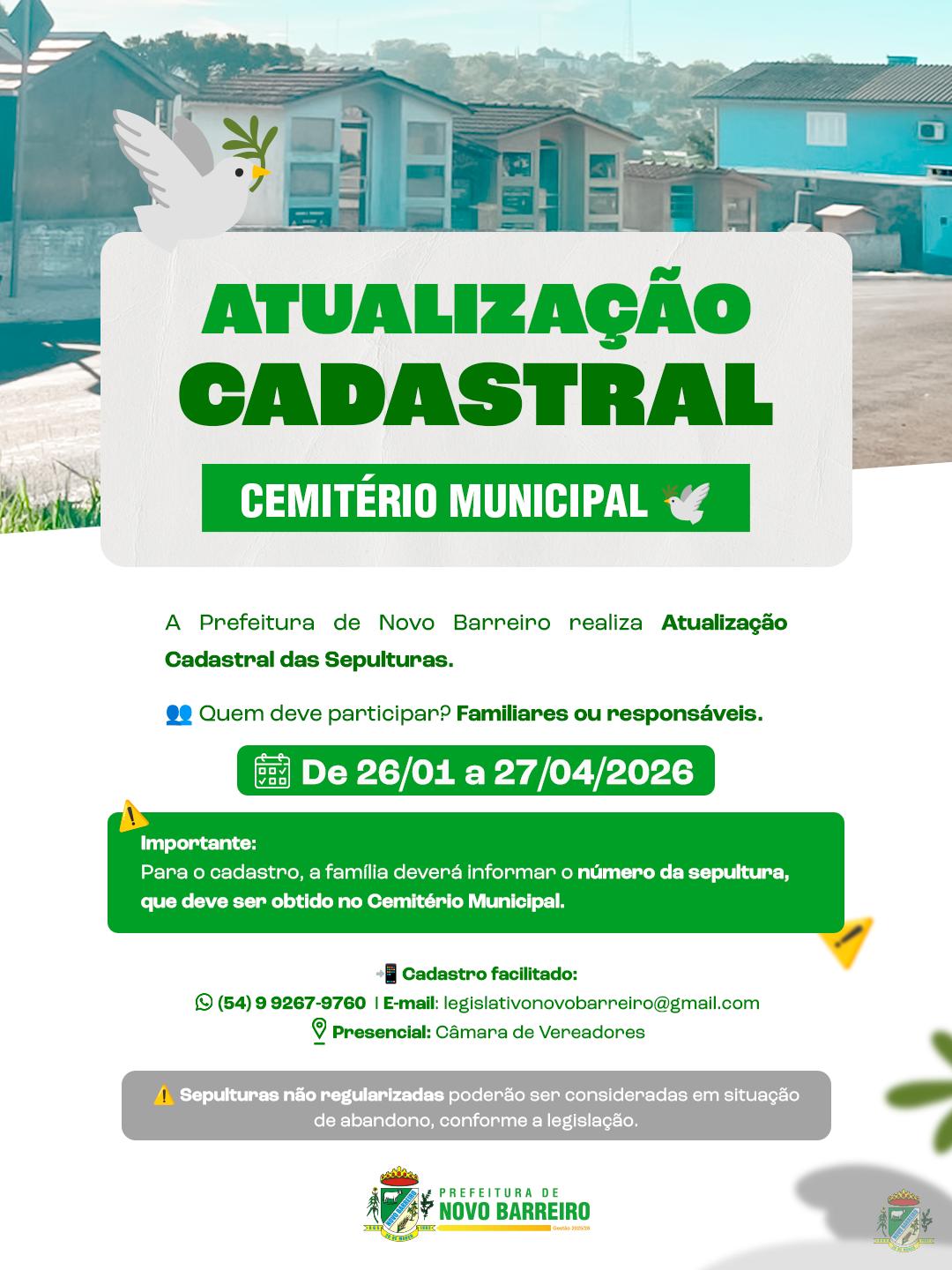 27/01/2026 - Prefeitura de Novo Barreiro realiza Chamamento Público para atualização cadastral das sepulturas do Cemitério Municipal